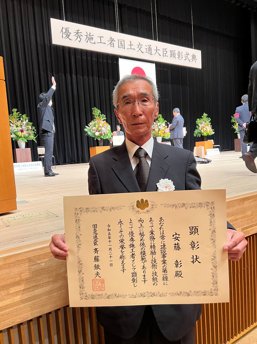 ㈱宮本運輸 安藤 彰氏「優秀施工者国土交通大臣賞」受賞北海道トナミ運輸2023年12月2日読了時間: 1分更新日:2024年4月16日この度当社グループ会社の㈱宮本運輸クレーン事業部 部長 安藤彰氏が長年にわたりクレーン技能の向上に努めたことで建設業に携わる優秀施工者として国土交通大臣賞を受賞しました。安藤部長 おめでとうございます。🎊宮本社長 吉報ありがとうございます。